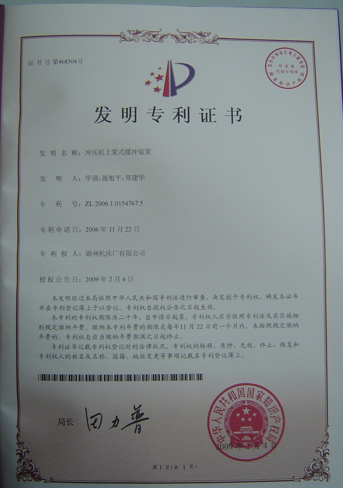 我公司申請的“沖壓機(jī)上置式緩沖裝置”,經(jīng)國家知識產(chǎn)權(quán)局依據(jù)中華人民共和國專利法審核,已于2009年2月4日獲國家發(fā)明專利授權(quán)。